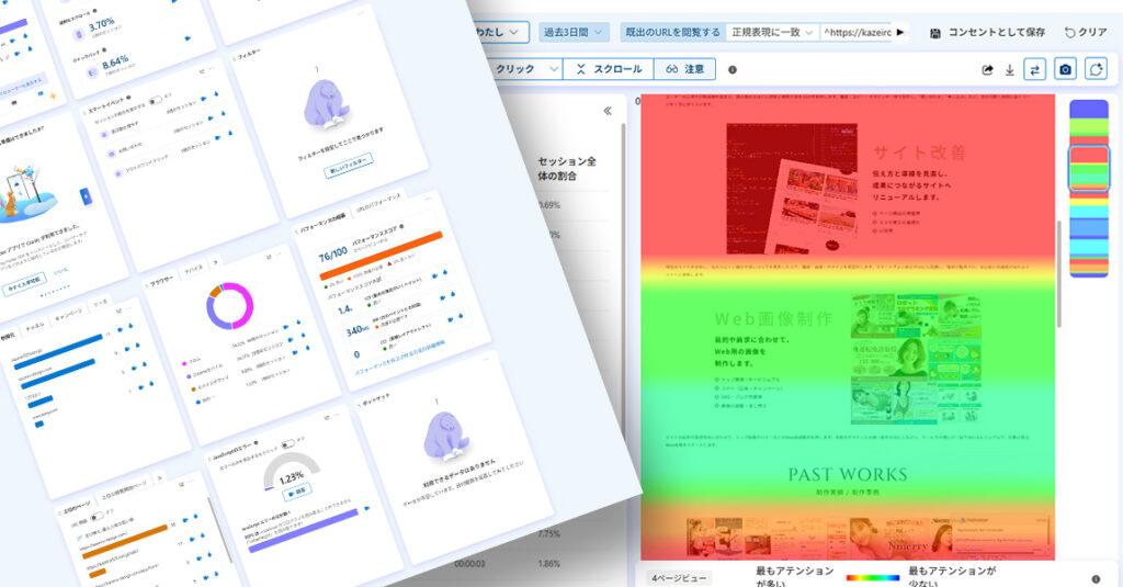 ヒートマップとは、Webサイトを訪れたユーザーが「どこをよく見ているか」「どこで迷っているか」「どこで離脱しているか」といった行動を、色の濃淡で可視化する分析ツールです。